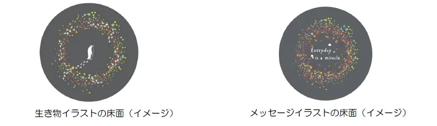 床面に海遊館の生き物やメッセージを添えたイラストを施しました。生き物のイラストには、実際の写真から型どりをした足跡が描かれています。