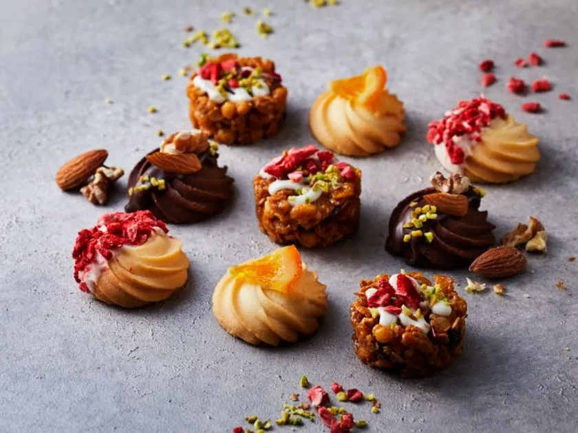 北海道産バターを贅沢に使用した生地に、一つ一つ丁寧に苺やオレンジ等のフルーツやナッツ等を飾り付け、一口サイズに焼き上げた可愛らしいプティクッキーです。宝石箱のような華やかなパッケージは、期間限定の春らしいカラーで、箱を開いた瞬間からワクワク感が止まらない、女性に喜ばれるギフトです。