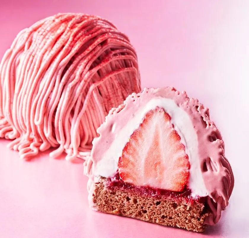 丸ごと1個使用したデラックスあまおうの上に、口解け滑らかな生クリームと甘酸っぱい苺クリームをたっぷり絞ったボリューム満点のモンブランです。口いっぱいに広がるあまおうの果汁をお楽しみください。
