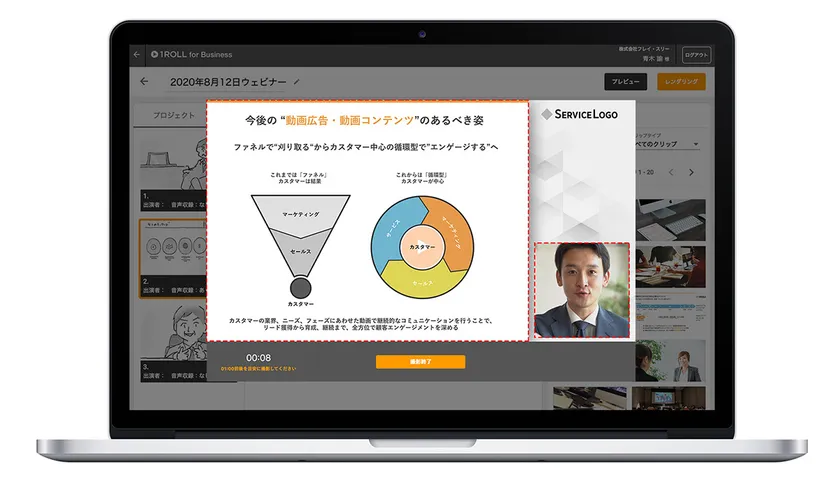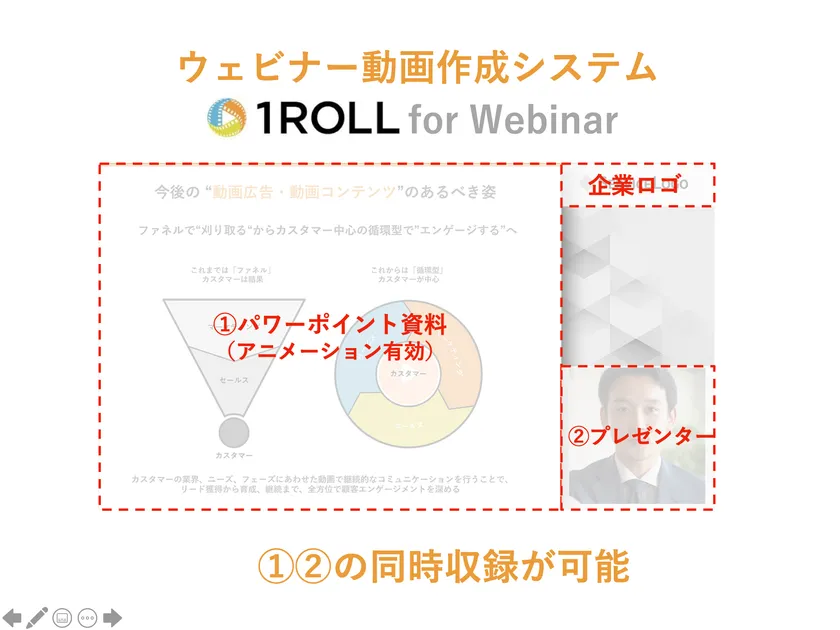 今回開発した新システムは、カメラ付ノートパソコン1台とセミナー用に用意したパワーポイント等のスライド資料さえあれば、アニメーションを含む資料とプレゼンターの説明が同期するウェビナー動画を誰でも簡単に作成できるものです。本システムはフレイ・スリーが開発提供している動画制作ツール 1Roll(ワンロール)の新しい機能として提供され、テレワーク先や担当者1人でも、企業のウェブサイト、社内や顧客向けポータルサイト、YouTubeチャンネル、SNS(交流サイト)に向けたウェビナー動画作成が可能です。また、動画作成だけでなく、動画管理、動画配信、解析機能も備わっているため、ウェビナー作成者と管理者の分業化や、従来のリアルセミナーではわからなかった参加者の視聴関心度の分析も可能です。