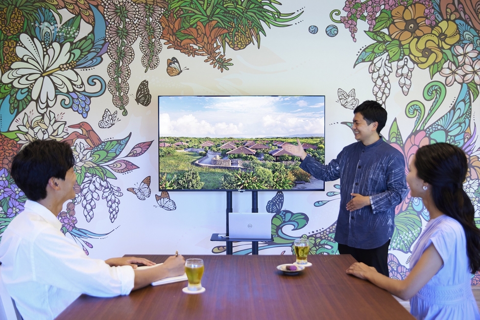 施設から送迎車で約5分の場所にあるヴィラには、フリードリンクやWi-Fi、各席から繋ぐことのできるコンセントなど仕事に便利な設備や備品を用意しています。また、島の動植物を色鮮やかに表現したアートウォールが特徴のフリースペースや、ミーティングやオンライン会議に便利な貸し切りスペースを備えています。ヴィラは、集落の中心部から離れていて、静かで風の音だけが聞こえる場所です。宿泊施設内とは異なり、仕事を行いたい人だけが利用する場所であるため、同行者と離れたり、寛ぐ空間と場所を分けたりすることで、より仕事に集中できます。