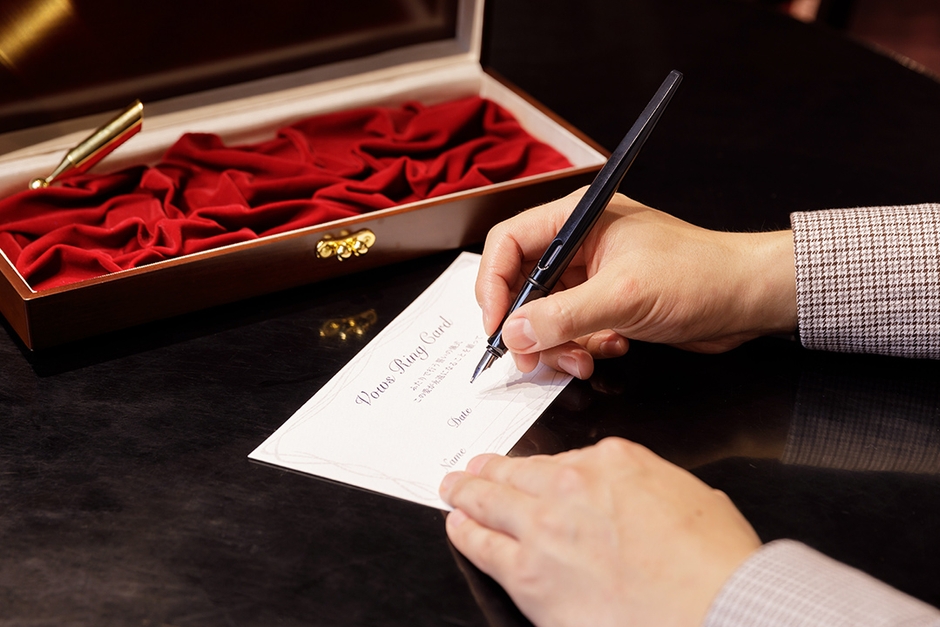 セレモニーを行ったふたりは、誓いをこめた証として専用の『Vows Ring Card』にサイン。日付とふたりの筆跡が記されたカードを大切な記念品に。