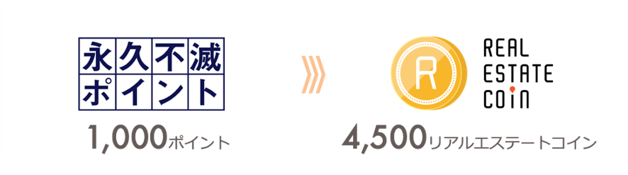 永久不滅ポイント1ポイントをリアルエステートコイン4.5コインに交換いたします。なお、永久不滅ポイントからの交換は1,000ポイント単位となります。