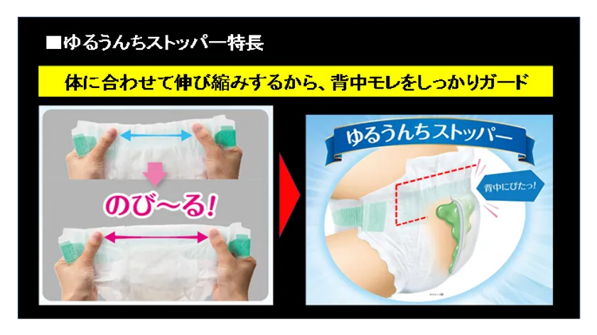 そこでこのたび、“ゆるゆる便“の背中モレを防ぐ、「ゆるうんちストッパー」を搭載した「ムーニー エアフィット※1」を、4月上旬より全国で発売します。