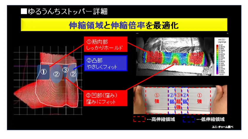 特許技術:単にしめつけるのではなく、伸びる範囲と強さを赤ちゃんの体に合わせて最適化しているため、しめつけずにフィットします。