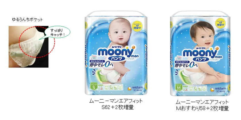 そこで、今回は大量の“ゆるゆる便”もすっぽりキャッチする「ゆるうんちポケット」が高評価のムーニーマン エアフィットSサイズ、Mおすわりサイズから、2枚増量の企画品を限定発売し、パンツ使用を促進します。