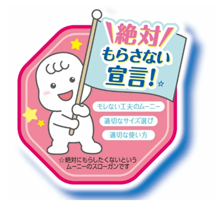 ☆ムーニーは、「絶対もらさない宣言」というスローガンを掲げ、テープ・パンツ両タイプでモレを解決する施策を提案し、今後も「育児負担軽減」に取り組んでいきます。