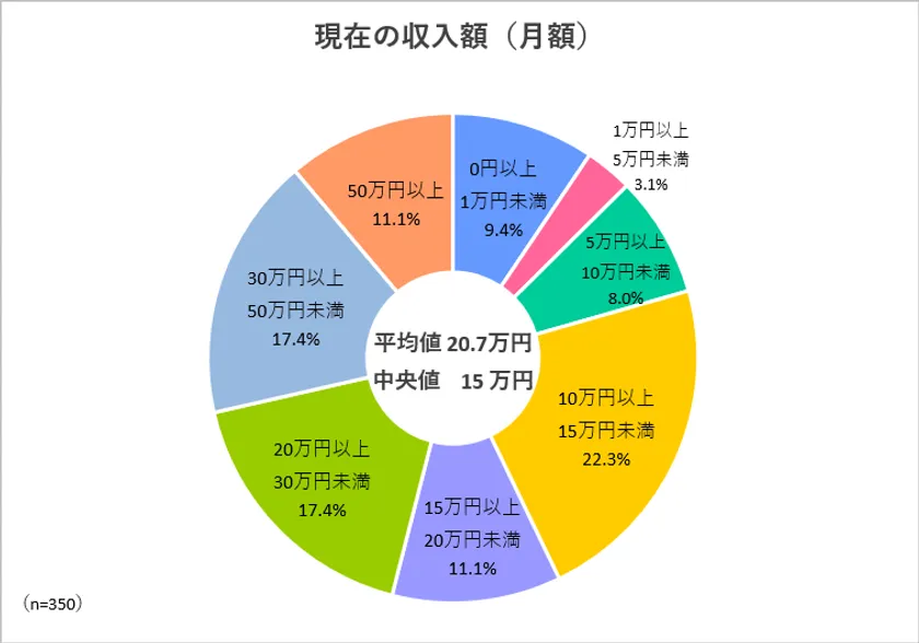 ●現在の収額(月収)の平均値は20.7万円、中央値は15万円