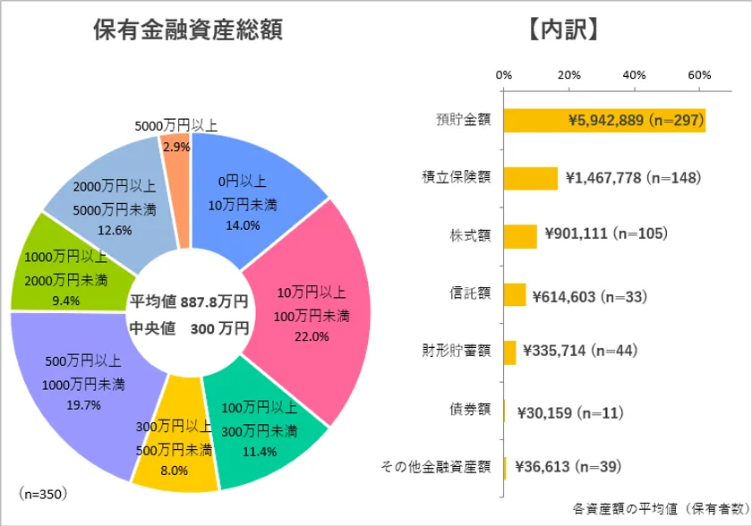 ●保有している金融資産額(総額)の平均値は887.8万円、中央値は300万円
