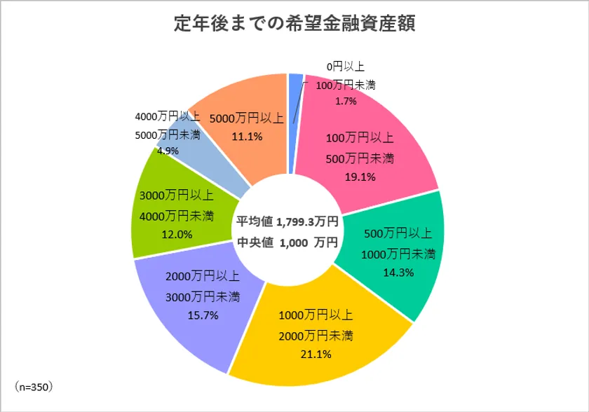 定年後(老後)までの希望金融資産額の平均値1,799.3万円、中央値1,000万円