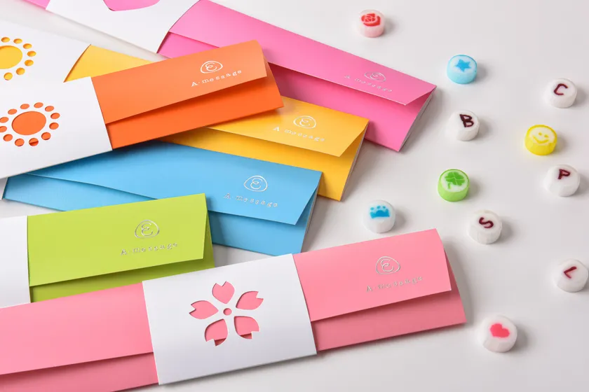 パッケージは手紙をイメージした紙の素材にリニューアル、お好みのカラーをお選びいただけます。あめで作ったメッセージとともに、手紙を送るように一言書き添えられることもできるデザインになりました。