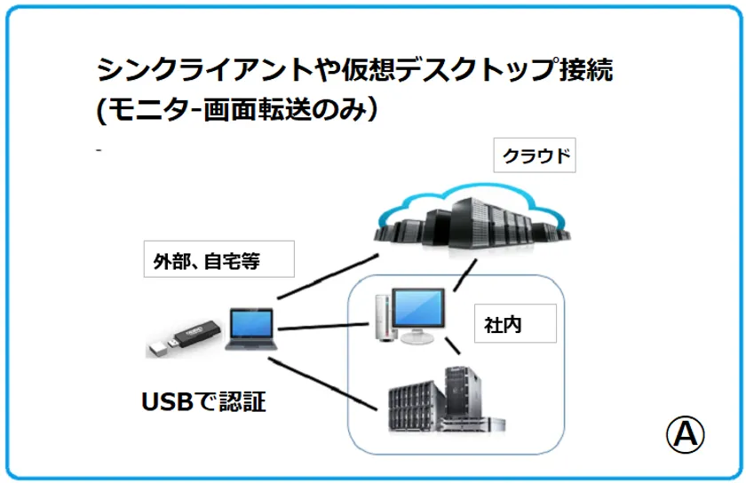 (A)外部持出シンクライアント端末やPCから、社内PCへリモートデスクトップ利用