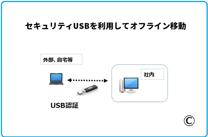 今までのシンクライアント利用ではオンライン利用環境で外部PC作業が行えました。外部USB内データをオフラインで安全に外部PC利用作業で行えます。PC内/USB内にはデータは残りません。