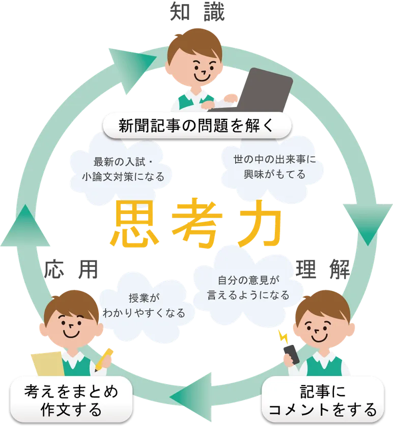 コースは、週2回配信される、最新の新聞記事を読み問いに答え、コメントをする『基本コース』と、さらに、考学舎講師による月1回または2回の添削指導のついた『思考力育成コース』の2コースを用意。基本知識を積み重ね(ステップ(1))、書かれた内容を理解し(ステップ(2))、自分の言葉で記述をする(ステップ(3))という3ステップで「思考力」を段階的に育むプログラムになっています。
