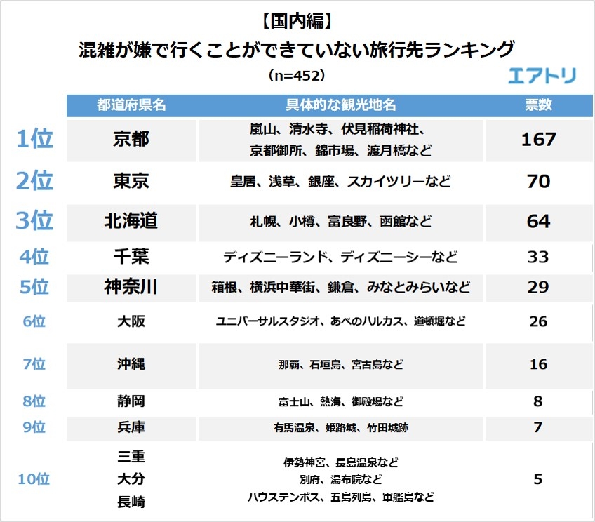 1位は「京都」、2位以降は「東京」「北海道」「千葉」「神奈川」と続きました。「京都」については嵐山・清水寺、「東京」は皇居・浅草など外国人観光客に人気のスポットも多く挙がっており、新型コロナで外国人観光客が減っていることをきっかけに日本人観光客が増える可能性もありそうです。