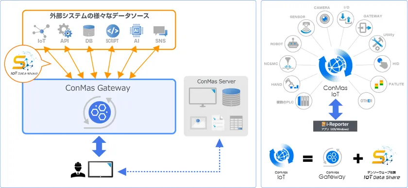 このオプションによりPLCをはじめとするIoT機器から直接リアルタイムにデータを取得できるようになりました。ConMas IoTオプションは、株式会社デンソーウェーブ(本社:愛知県知多郡阿久比町、代表取締役社長:中川 弘靖)のデータ統合ソフトウェア「IoT Data Share」とConMas Gatewayの組み合わせにより、PLCをはじめとする160以上のIoT機器のデータをConMas i-Reporterの帳票へ自動記入することが、可能になります。