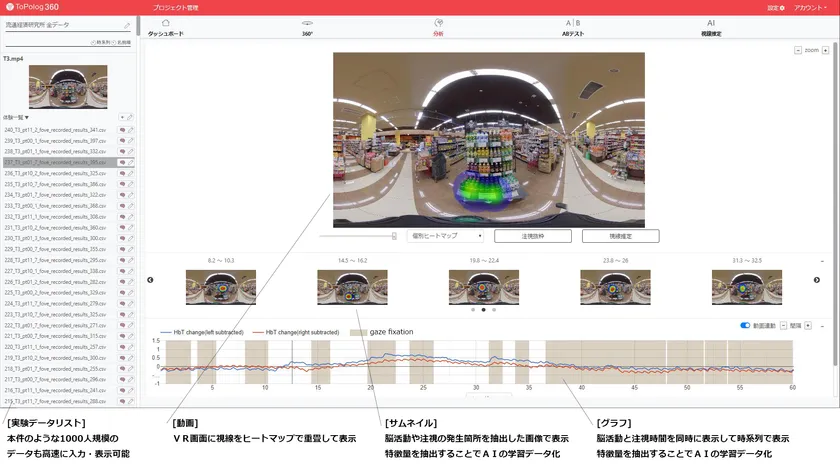 今回の実験では、商品陳列を見始めてから、商品を1つ購入意思決定するまでのヒトの心理過程を解析するために、「NeU-VR」によるNIRS前頭前野脳活動計測およびアイトラッキングを行いました。実在する小売店(食品スーパー)実写の360°画像を撮影し、これをVR内で視聴することで、実験室にいながら食品スーパーの売場環境を再現することを可能としております。