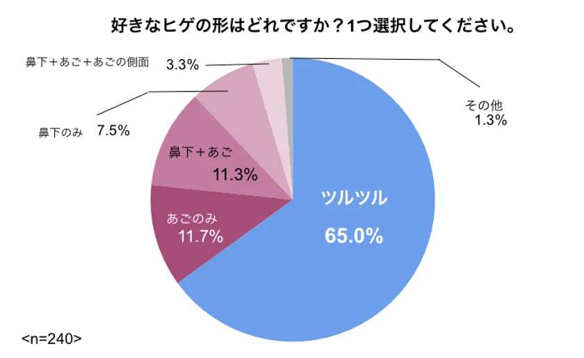 「好きなヒゲの形を1つ選んでください」という設問では、「ツルツル」を選んだ人が65%と最多数でした。最近ではデザインヒゲが人気ですが、「ヒゲはないほうがいい」という女性の本音が垣間見えます。