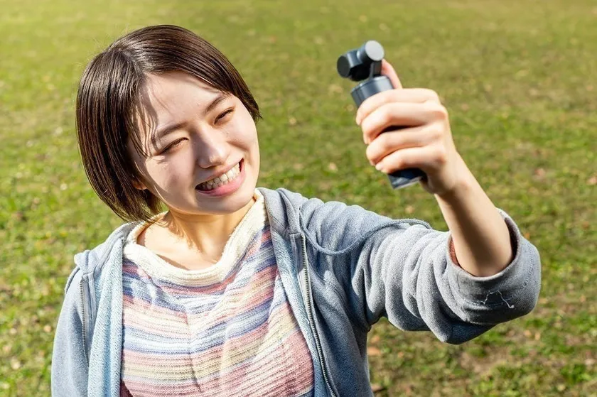 さらに電源のオンオフ、録画のスタートやストップ、「ジンバル」の設定までカメラを握ったまま指先一つで操作可能で、自撮りも簡単に行えます。