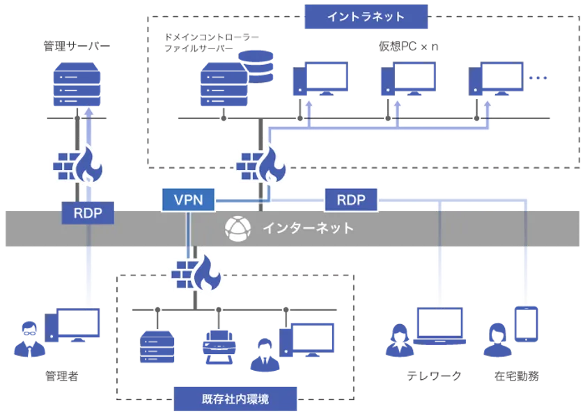 また、VPN(Virtual Private Network)※1 によって既存システムと連携し、現有ファイルサーバへのアクセス、現有プリンタへの出力などが可能となります。