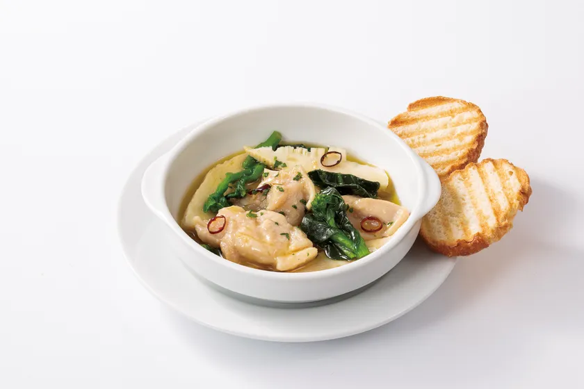 チキンと春野菜をアヒージョ風に仕上げた、ビールのお供にもワインのお供にもおすすめの一品です。