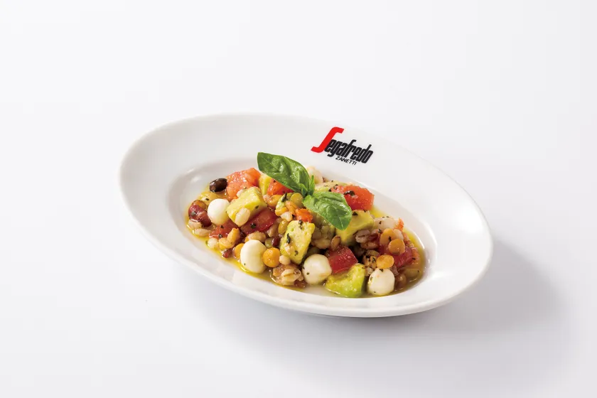 雑穀とアボカド、トマトを合わせたサラダに、パールサイズのモッツァレラを加え、バジルの香り豊かなドレッシングで仕上げました。