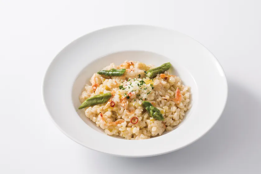 リゾットからは、春の食材“桜えび”と“アスパラ”を、アンチョビ風味のピリ辛なオイルソースで仕上げた「桜えびとアスパラのアンチョビソース」(800円)と、イタリアの燻製生ハム(スペック)と、同じくイタリアでは定番の春食材“アーティチョーク”を、チキンクリームソースで仕上げたリゾットにトッピングした本格派な味わいの「燻製生ハムとアーティチョークのクリームソース」(800円)。