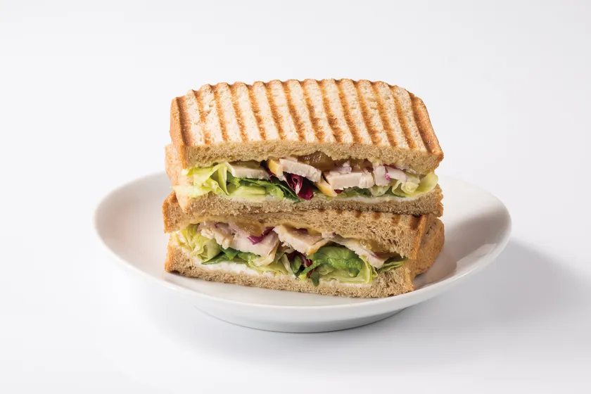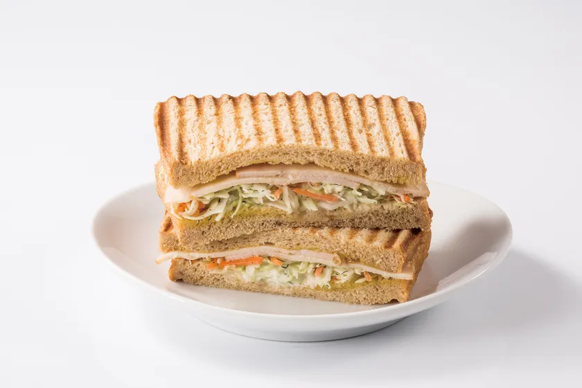 ふんわり柔らかなライ麦パンで、スライスチキンとサラダをマンゴーチャツネソースと共にサンドした、ボリューム感のある断面が食欲をそそる一品です。
