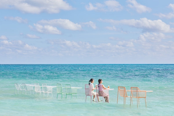 ホテル隣接のビーチから遠浅の海を歩いた先に、色とりどりの海上カウンター席が登場。波の音に耳を傾けながら透明度の高い海に足先を浸ければ、白と青だけの世界に浮かび上がるカラフルな海上カウンター席が、夏の陽気と歓喜あふれる気分をひときわ盛り上げます。海と一体化した至福の時間を過ごすことのできる場所です。