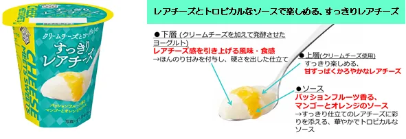 『CHEESE MEETS SWEETS すっきりレアチーズ』は、レアチーズとトロピカルなソースで楽しめる、すっきりレアチーズです。パッケージは、スプーンですくったシズルで中身のわかりやすさと、六角形の形状を活かした面で切り替えたメリハリのある2色づかいで視認性をアップし、手に取りたくなるデザインに仕上げました。