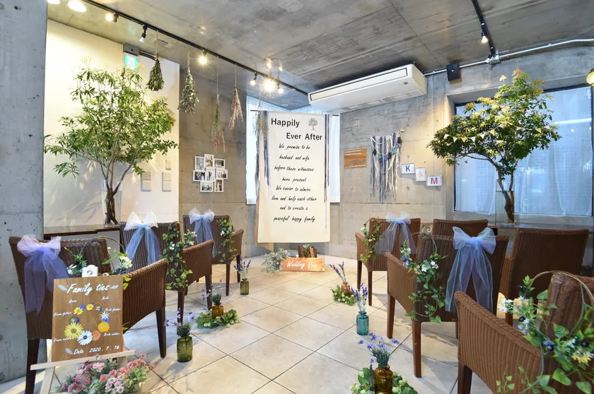 セレモニー後は1Fでお祝いしながらゆったりお食事会。家族での記念写真も撮影いたします。