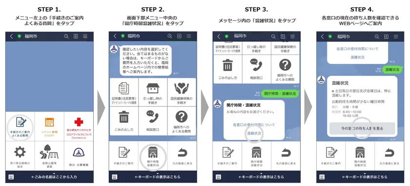 この機能の追加により、友だち数約165万人の福岡市LINE公式アカウント(ID:@fukuokacity)上で、引っ越しに関する手続きや手続きに必要なものを前もって調べたり、窓口の混雑状況をチェックしたりできるようになります。福岡市ホームページの「引越し手続きのオンライン予約サービス」にもリンクしており、市民の窓口での待ち時間短縮と、職員の事務負担軽減を実現いたします。