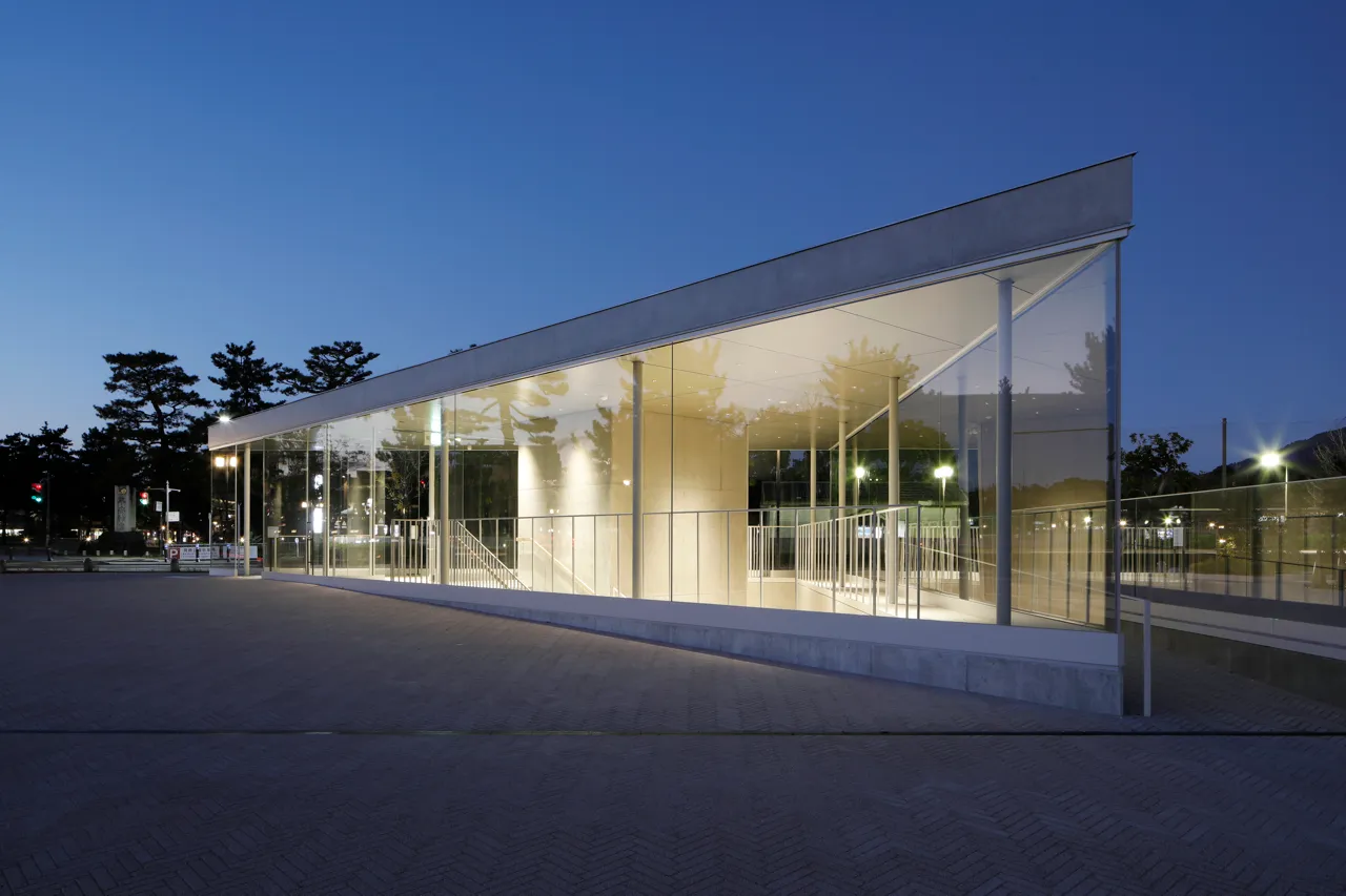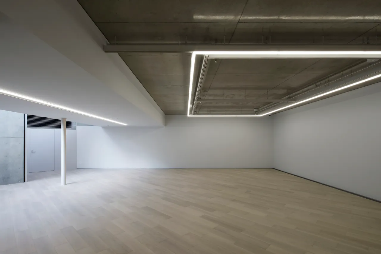 三角形のガラス建築である北西エントランスの直下,本館地下1階に位置する「ザ・トライアングル」。(面積:約60平方メートル,天井高:約3m) 撮影:来田猛