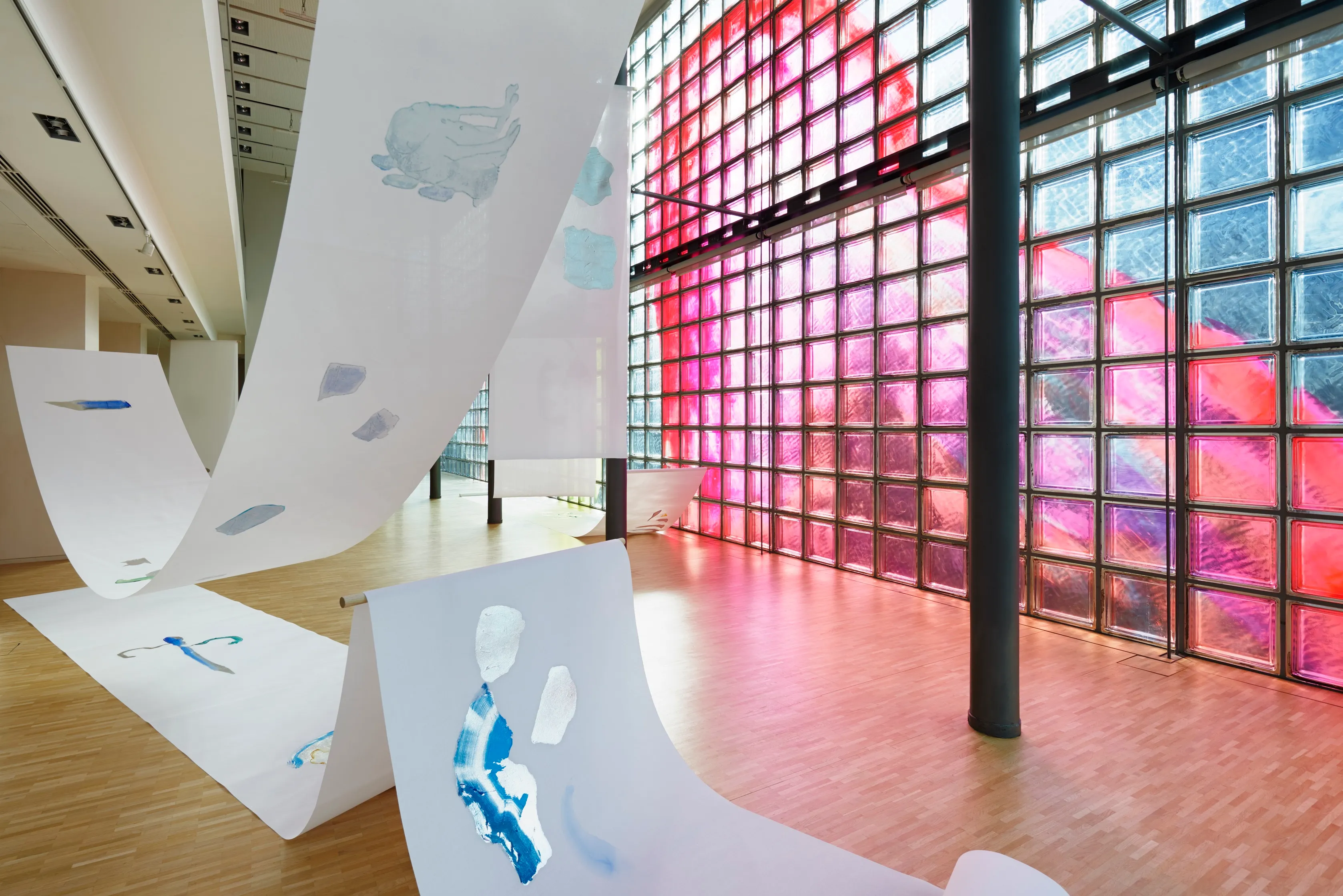 シリーズ初回では,プレオープニングイベントでの広がりや,次世代作家への刺激となることを期待して,豊富な発表経験を持つ鬼頭健吾を取り上げます。日常的な素材を組み合わせてカラフルな空間を構成することで知られる鬼頭は,一貫して色彩の体験や光の考察に基づく「絵画」をテーマに制作を続けてきました。2000年代に若手作家の中から頭角を現して以降も意欲的に作家活動を展開。本展ではキャンバスに様々な画材を用いたペインティングに,生地,シュラフ,透明ビニールなどを接続した平面作品のほか,着彩ガラスを用いたインスタレーションなど近作と新作を発表します。北西エントランスに設置された《ghost flowers》,本館のパブリック・アート《untitled (hula-hoop)》と併せて,鬼頭作品が鑑賞者を迎えます。
