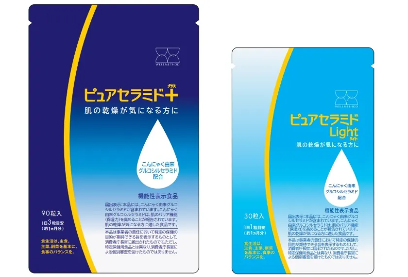 「ピュアセラミド+(プラス)」および「ピュアセラミドLight(ライト)」は、いずれも「こんにゃく由来グルコシルセラミド」を機能性関与成分とするカプセル状の食品で、1日あたりの摂取目安量はそれぞれ1.8mg、0.6mgです。