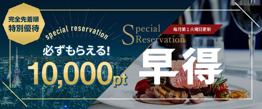 ふるさと納税サイト「ふるなび」会員限定の数量限定・先着順の特別優待コース「早得」は、日頃ふるなびをご愛顧いただいている会員様に、厳選されたレストランでお食事を、“お得に”楽しんでいただきたいという想いから誕生したサービスです。「早得」を利用することで、東京都内を中心に全国300店舗以上で利用可能な1万円分のグルメポイントが必ずもらえます。