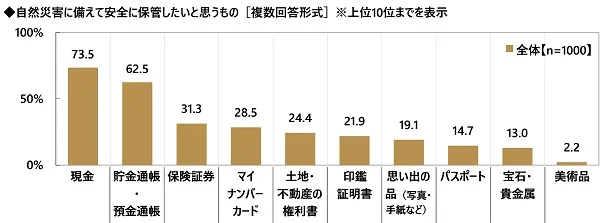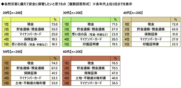 ■自然災害に備えて安全に保管したいもの TOP5は「現金」「通帳」「保険証券」「マイナンバーカード」「不動産の権利書」