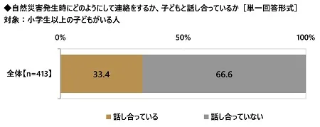 小学生以上の子どもがいる人(413名)に、自然災害発生時にどのようにして連絡をするか、子どもと話し合っているか聞いたところ、「話し合っている」は33.4%と、3人に1人の割合となりました。