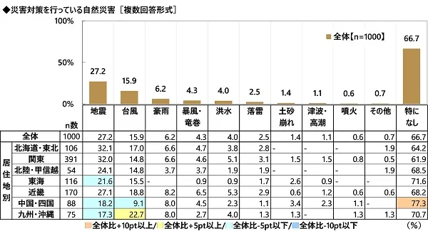 居住地別にみると、九州・沖縄では、「台風」(22.7%)が他の地域と比べて高くなりました。台風が頻繁に接近・通過する九州・沖縄では、台風対策を行っている人が多いようです。