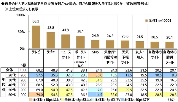 続いて、全回答者(1,000名)に、自身の住んでいる地域で自然災害が起こった場合、何から情報を入手すると思うか聞いたところ、「テレビ」(68.2%)が最も高く、次いで、「ラジオ」(48.8%)、「ニュースサイト」(41.8%)、「ポータルサイト(Yahoo!など)」(38.1%)、「SNS」(24.9%)となりました。