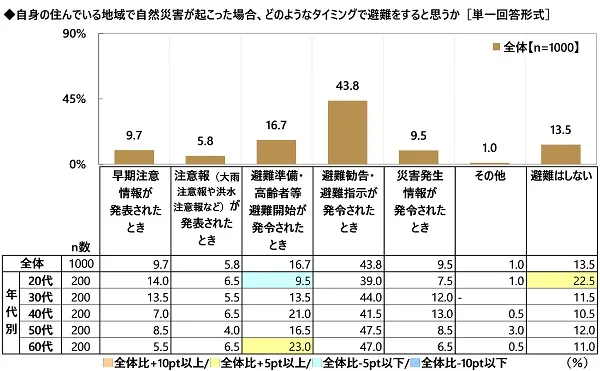 全回答者(1,000名)に、自身の住んでいる地域で自然災害が起こった場合、どのようなタイミングで避難をすると思うか聞いたところ、「避難勧告・避難指示が発令されたとき」(43.8%)が最も高く、次いで、「避難準備・高齢者等避難開始が発令されたとき」(16.7%)、「早期注意情報が発表されたとき」(9.7%)、「災害発生情報が発令されたとき」(9.5%)、「注意報(大雨注意報や洪水注意報など)が発表されたとき」(5.8%)となりました。対象地域住民全員の避難が必要とされる“避難勧告・避難指示”が発令されたときに避難を開始する人が多いようです。「早期注意情報」の発表で避難する人は、1割と少数派でした。また、「避難はしない」は13.5%となりました。