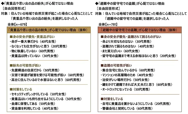 自然災害が起こった場合に心配なこととして「貴重品や思い出の品の紛失」「避難中の留守宅での盗難」を選択しなかった人に、心配ではない理由を自由回答形式で聞きました。