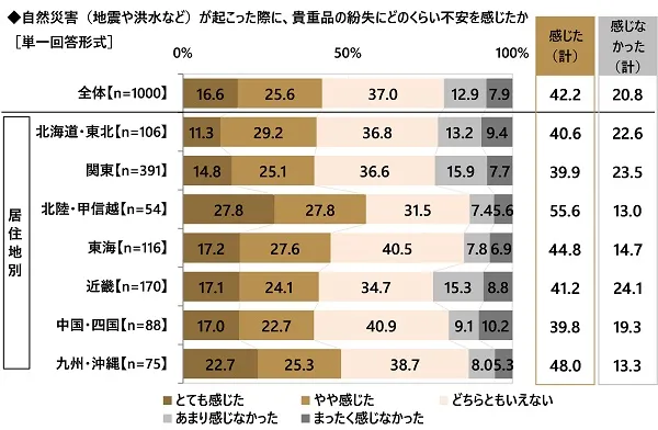 ■「自然災害発生時、貴重品の紛失に不安を感じた」4割強 北陸・甲信越居住者では5割半が「不安を感じた」と回答