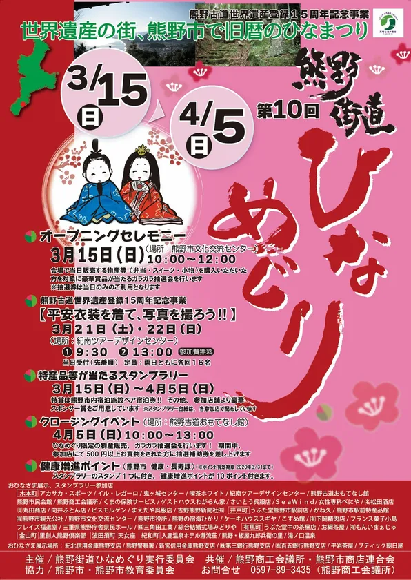 また、市内店舗や観光施設等42か所を回ってスタンプを集め応募すると、抽選で熊野市の特産品などが当たる『熊野街道ひなめぐりスタンプラリー』も開催いたします。