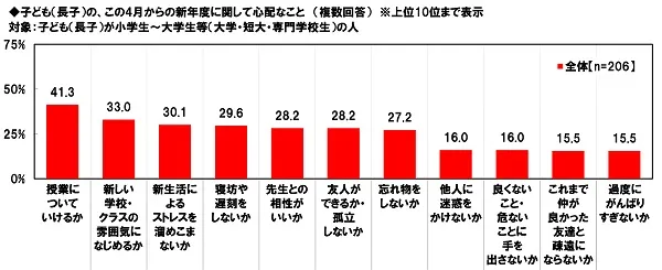 子ども(長子)が小学生~大学生等(大学・短大・専門学校生)の人(206名)に、子ども(長子)の4月からの新年度に関して、どのようなことが心配か聞いたところ、「授業についていけるか」(41.3%)が最も高く、次いで、「新しい学校・クラスの雰囲気になじめるか」(33.0%)、「新生活によるストレスを溜めこまないか」(30.1%)、「寝坊や遅刻をしないか」(29.6%)、「先生との相性がいいか」「友人ができるか・孤立しないか」(同率28.2%)となりました。