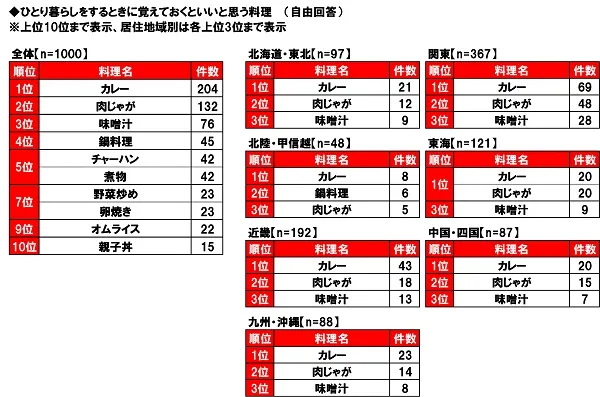 全回答者(1,000名)に、ひとり暮らしをするときに覚えておくといいと思う料理を聞いたところ、1位は「カレー」(204件)、2位は「肉じゃが」(132件)、3位は「味噌汁」(76件)となりました。1位から3位までに挙げられた料理は、どれも家庭料理の定番で、調理にあまり手間がかからず、栄養が豊富なものばかりです。ひとり暮らしをする際に覚えておくと、役に立つのではないでしょうか。