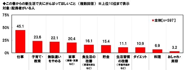 次に、配偶者がいる人(597名)に、この春からの新生活で夫にがんばってほしいことを聞いたところ、「仕事」(45.1%)が最も高く、次いで、「子育て・教育」(23.6%)、「無駄遣いをやめる」(22.1%)、「家事(掃除・洗濯など)」(20.4%)、「食生活の改善(野菜を摂るなど)」(16.1%)となりました。