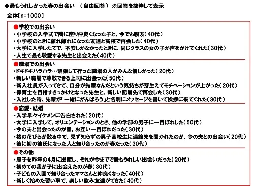 全回答者(1,000名)に、最もうれしかった春の出会いについて聞いたところ、「小学校の入学式で隣に座り仲良くなった子と、今でも親友(40代)」、「小学校のときに離れ離れになった友達と高校で再会した(40代)」、「ドキドキハラハラ…緊張して行った職場の人がみんな優しかった(20代)」、「新しい職場で尊敬できる上司に出会った(50代)」など、学校や職場での出会いに関する回答が多く挙げられました。また、「入学早々イケメンに告白された(20代)」や「後に初の彼氏になった人と知り合ったのが春だった(30代)」など、恋が始まった人や、「桜の花びらが散る中で、見ず知らずの男子高校生に連絡先を聞かれたのが、今の夫との出会い(20代)」や「今の夫と出会ったのが春。お互い一目ぼれだった(30代)」など、人生のパートナーと出会った人もいるようです。