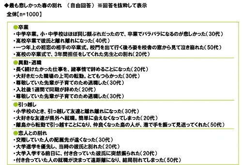 続いて、全回答者(1,000名)に、最も悲しかった春の別れについて聞いたところ、「中学卒業。小・中学校はほぼ同じ顔ぶれだったので、卒業でバラバラになるのが悲しかった(30代)」、「高校卒業で彼氏と離れ離れになった(40代)」など、卒業による別れが多く挙げられました。また、「長く続けたかった仕事を、諸事情で辞めることになった(20代)」や「大好きだった職場の上司の転勤。とてもつらかった(30代)」、「入社後1週間で同期が辞めた(20代)」など、職場での退職や異動による別れについての回答が多く挙げられました。そのほか、「小学校のとき、引っ越して友達と離れ離れになった(30代)」など、引っ越しによる悲しい別れや、「付き合っていた人の就職が決まって遠距離になり、結局別れてしまった(50代)」や「大学進学を優先し、当時の彼氏と別れた(20代)」など、恋人との別れを経験した人もいるようです。