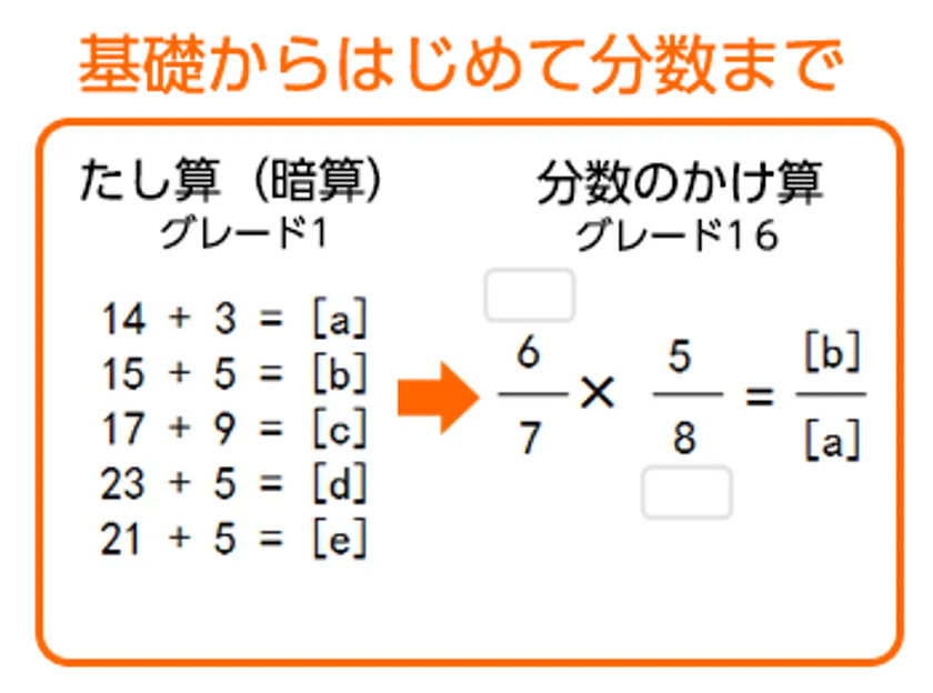 「ルネさんすう特別コース」は、基礎的な計算力・暗算力を高める無料のオンライン教材「ルネさんすう」より、特別に問題を選び抜いたコースです。パソコンのほかスマホ・タブレットを使い、どこでも手軽に計算力のトレーニングができるeラーニングです。暗算力をつけるため、四則演算の基礎から段階的にグレードを上げて受講できるようになっています。